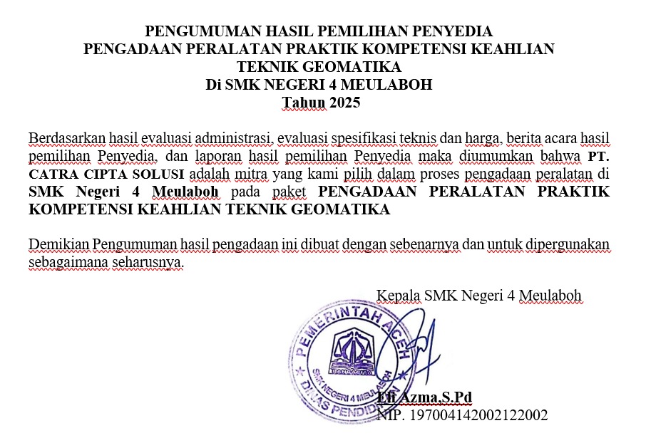 Pengumuman Hasil Pemilihan Penyedia Pengadaan Peralatan Praktik Kempetensi Keahlian Teknik Geomatika Redaksi - SMKN 4 Meulaboh 5 Dec 2025 - 17:17 Pengumuman